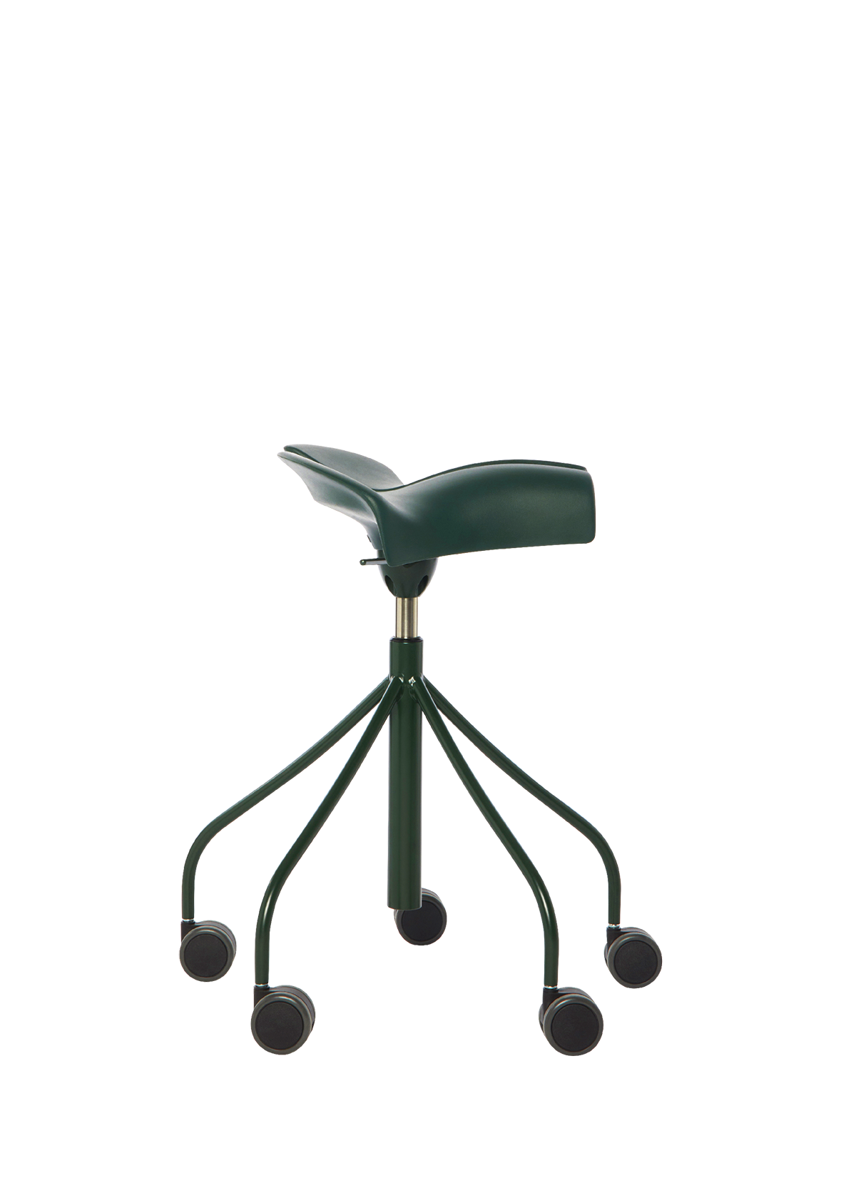 An iconic stool that works on an ergonomic level and aesthetic. How we sit has a major effect on our lives. Doctor Jordi Badia and industrial designer Otto Canalda created a stool that would follow medical principles, be appropriate for any seated activity, and stay stylish. The Binaria was developed to sit within laboratories, clinics, salons and offices. It has a rational design with an unobtrusive and dynamic style. The back automatically sits on its natural curves, reducing load, while the small and wide seat promotes hip articulation and optimal comfort, stability, and positioning for the core. Now, the chair comes in an updated colour palette, including bottle green. Improving the ergonomics of various professions. Its polyurethane and steel composition and patented seat shape allow for height adjustment to maintain mobility for all.