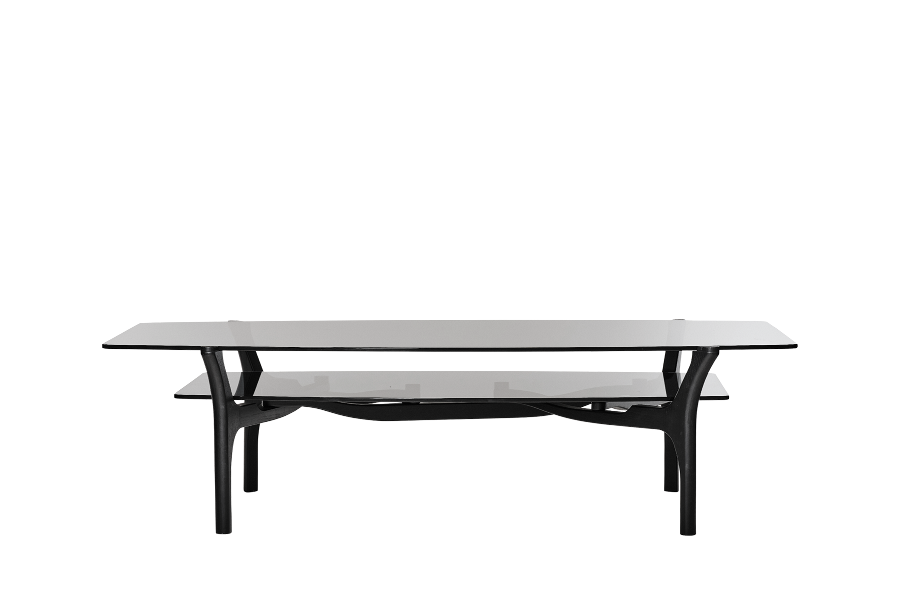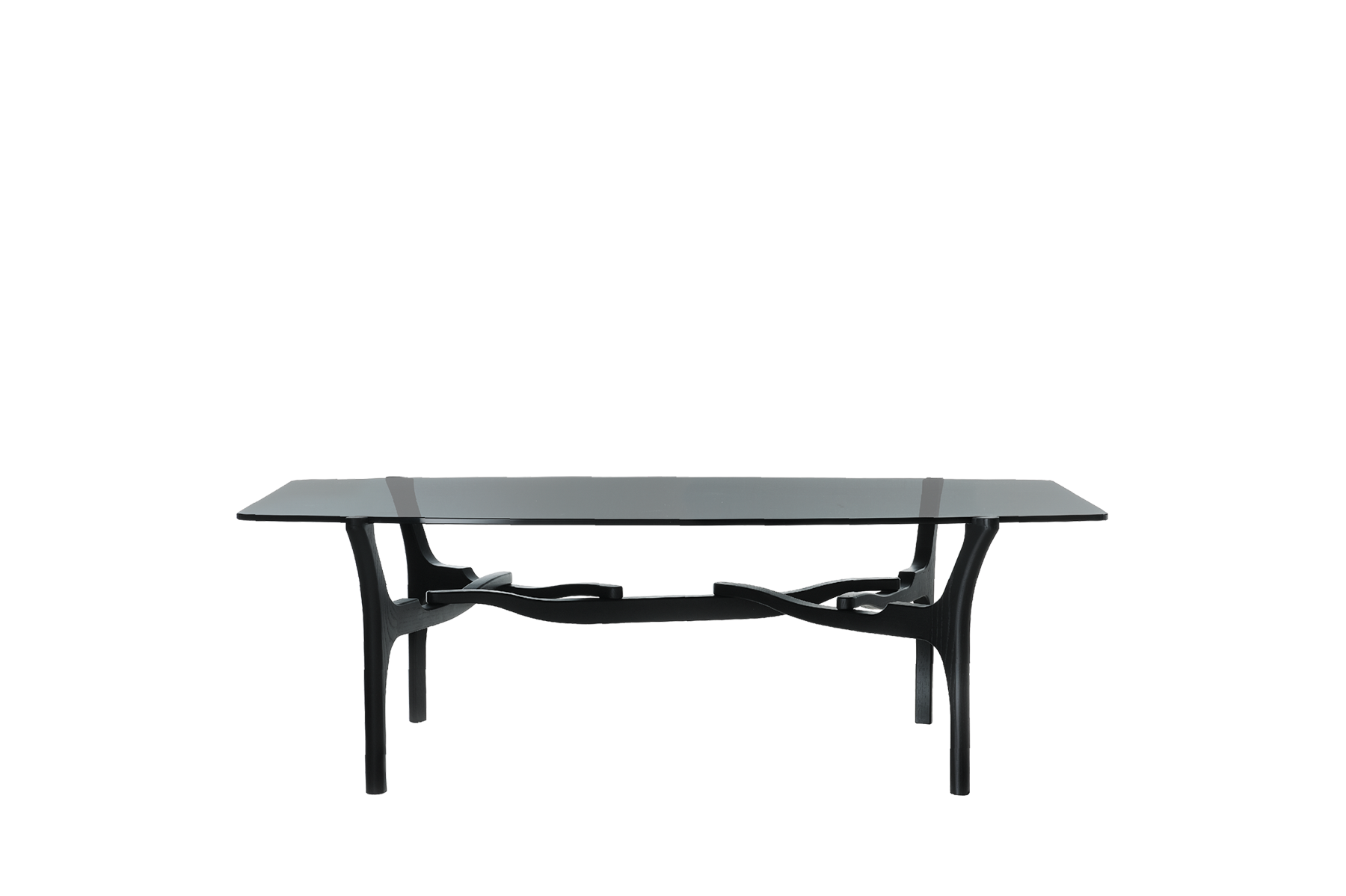 Bordering the surreal behind the glass. The Carlinas tables create lines fit for a gallery and set for the table. Cheekily calling to Carlo Mollino’s influence on Oscar Tusquets, these tables were named Carlinas. The smoked glass tabletop exposes the supporting structures. Like Mollino’s nature-informed pieces, the Carlinas have twisting stretchers of wood. They triangulate on the side table and stabilise larger tables with a diagonal crossbar. The supports twist like entwined fingers, and legs come out of the table like bent knees.