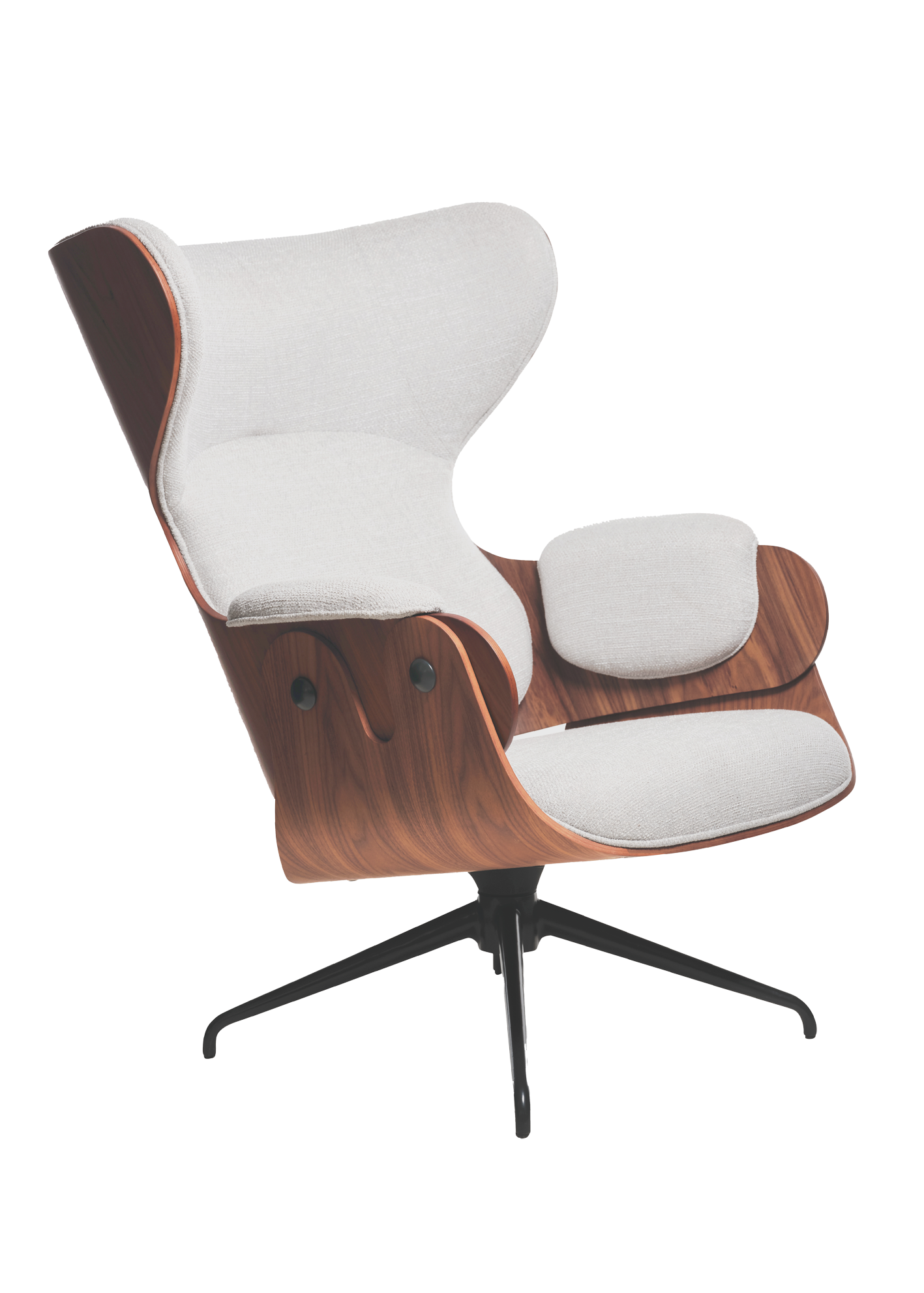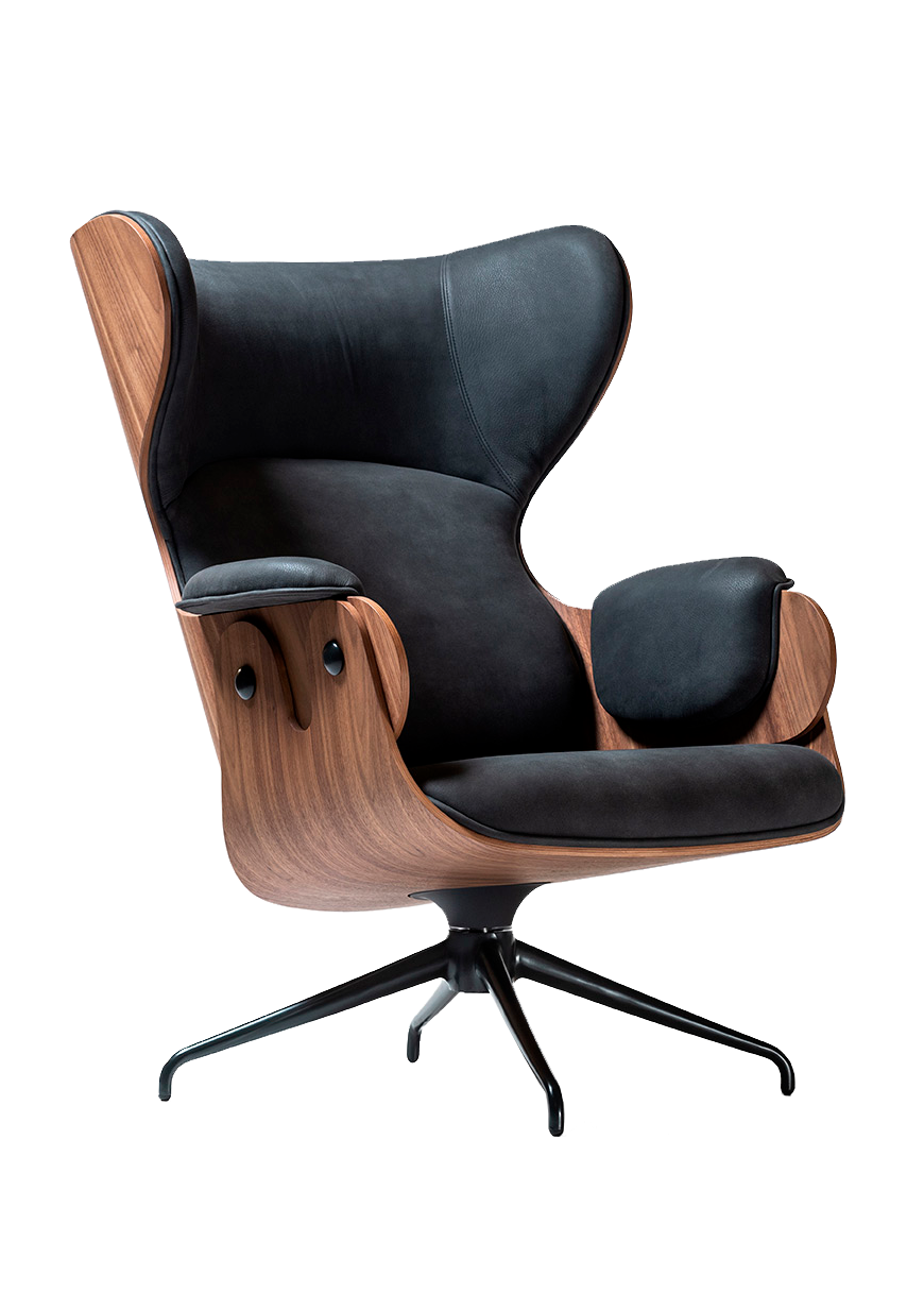 Jaime Hayon’s Lounger has a curved structure and incredible comfort. A sitter can simply sink into comfort and relax in grace. The elegant and comfortable components mix with the exposed structure of the seat. The visible grain and veneered wood highlight the unique subtleties of the Lounger. Its soft fabrics, supple leather and ottoman invite a moment to lay back and relax in the plush shell. Hayon plays with the modern classic of the Eames Lounge Chair, similarly dedicating his Lounger to the future with enduring, high-quality materials and an elegant form. The armchair has a spacious quality that matches its gorgeous materials, finishes and colours.