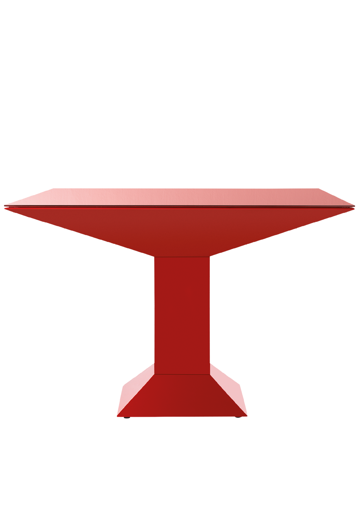 The Mettsass is a big, red moment in a room. Ettore Sottsass designed the table with a confident shape and bright colour. It is bold and powerful. It is constantly new. The Italian architect, industrial designer, innovator and artist Ettore Sottsass designed the Mettsass table for BD in 1972, nearly a decade before co-founding the Memphis movement, which shifted modern design forever. He was always one to experiment, and his preoccupation with nonconformity defined the architecture of the Mettsass with flat sheets of steel, a vibrant coat of red, and a cultivation of aesthetics and emotion. The colour and geometry are bold and conspicuous, far from the Bauhaus minimalism of the era. Reissued in 2012 and still in production today, the Mettsass remains functional but has a sensory dimension that is traditionally inaccessible. It works as a table and sits like a giant gem.