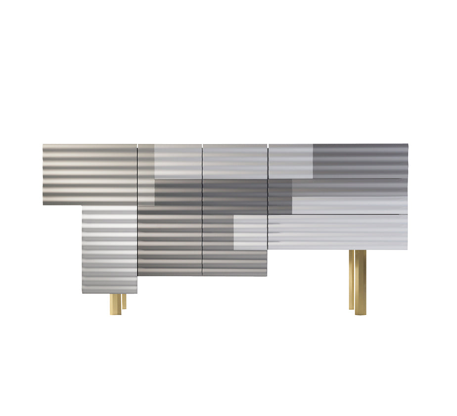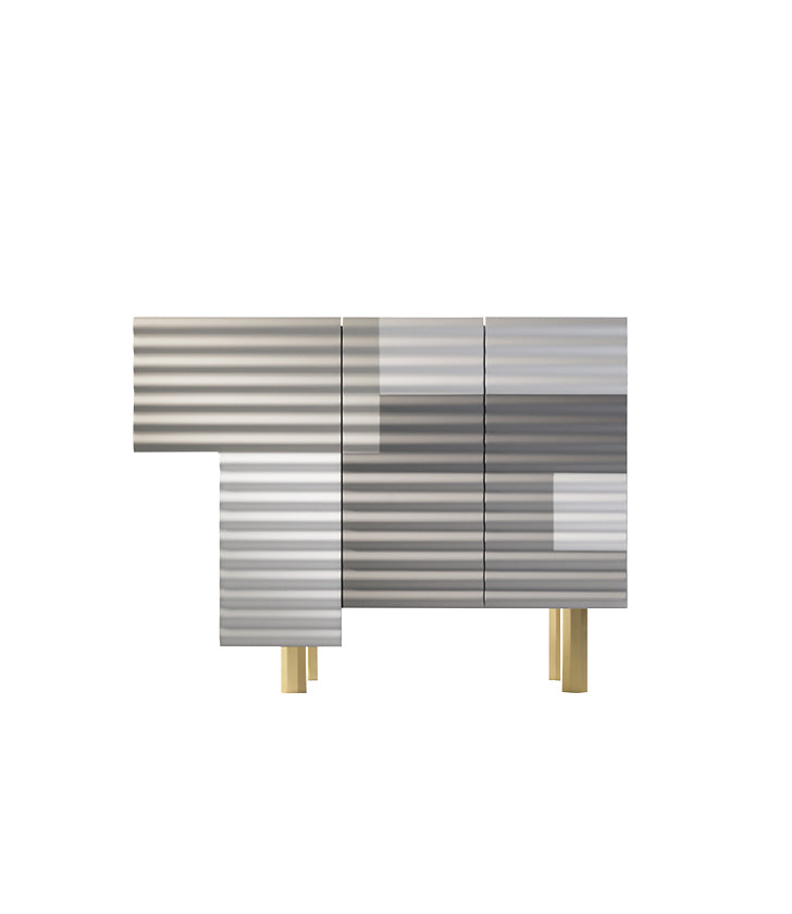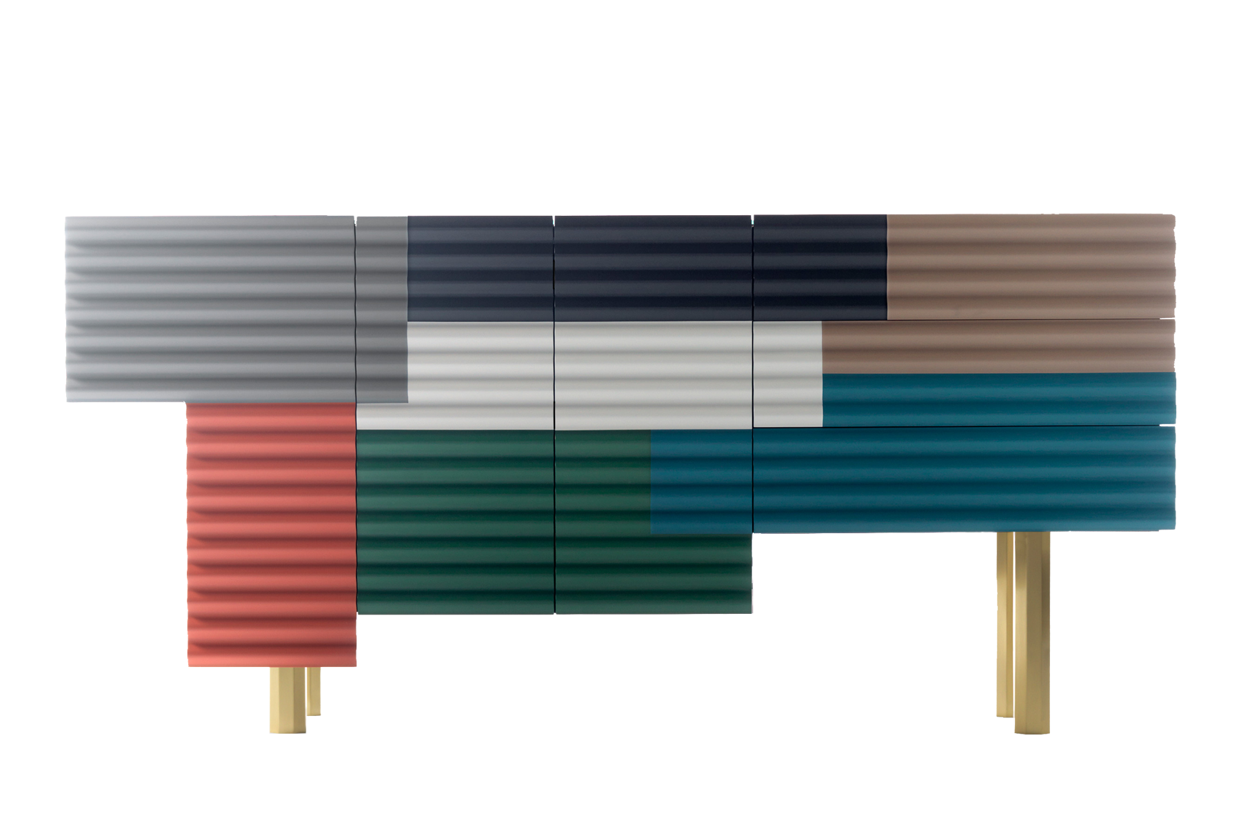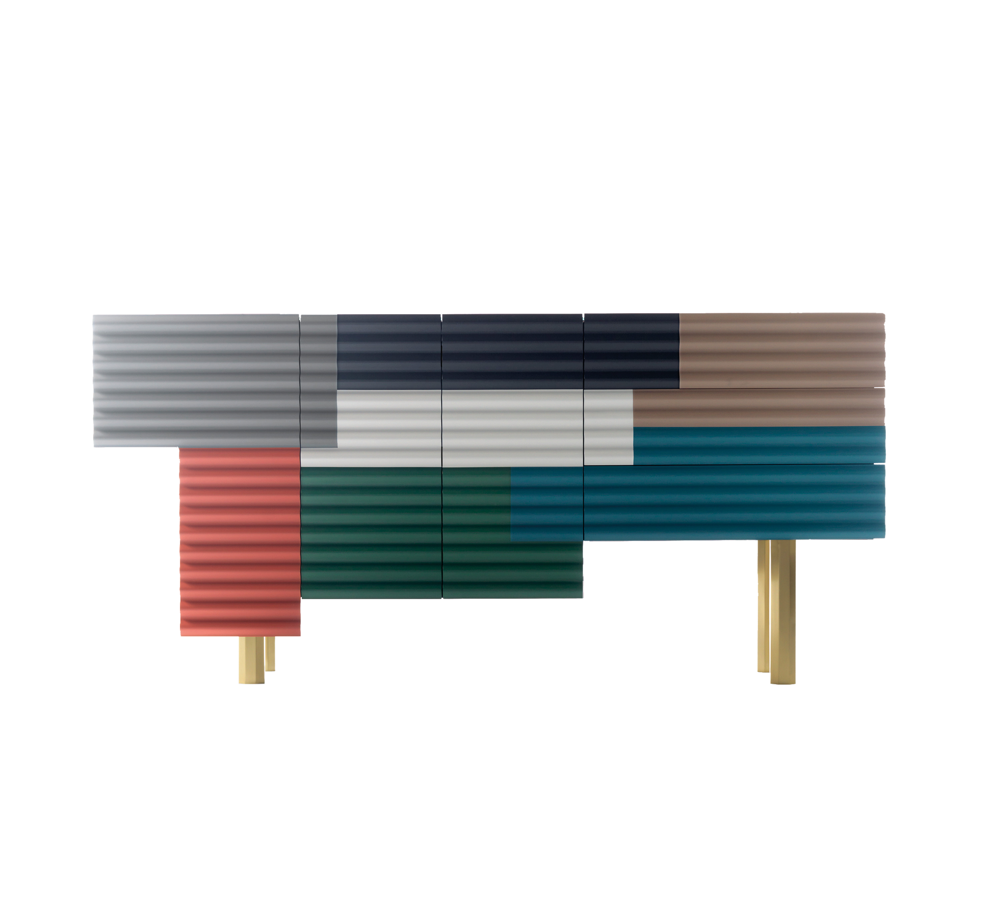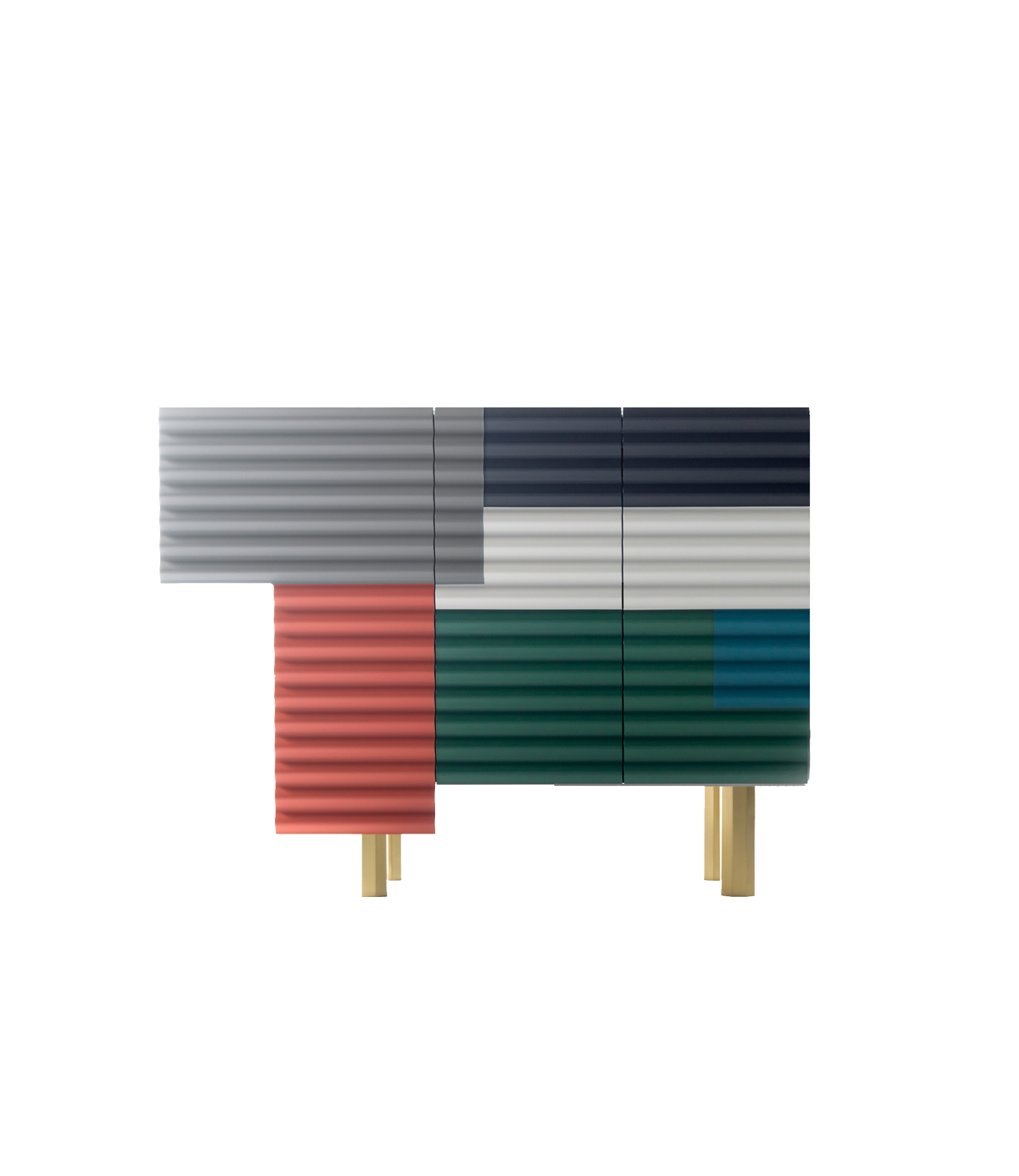 The Shanty Cabinet was created by designers Nipa Doshi and Jonathan Levien. They were inspired by the corrugated iron and plastic improvised structures found in shanty towns worldwide. It its feet are in matte gold and the ridged façade of the cabinet is asymmetrical, with different colour options ranging between Shanty Summer and multicoloured and Shanty Winter and grey. The Small version comes with folding doors, while the Large version has folding doors and three drawers.